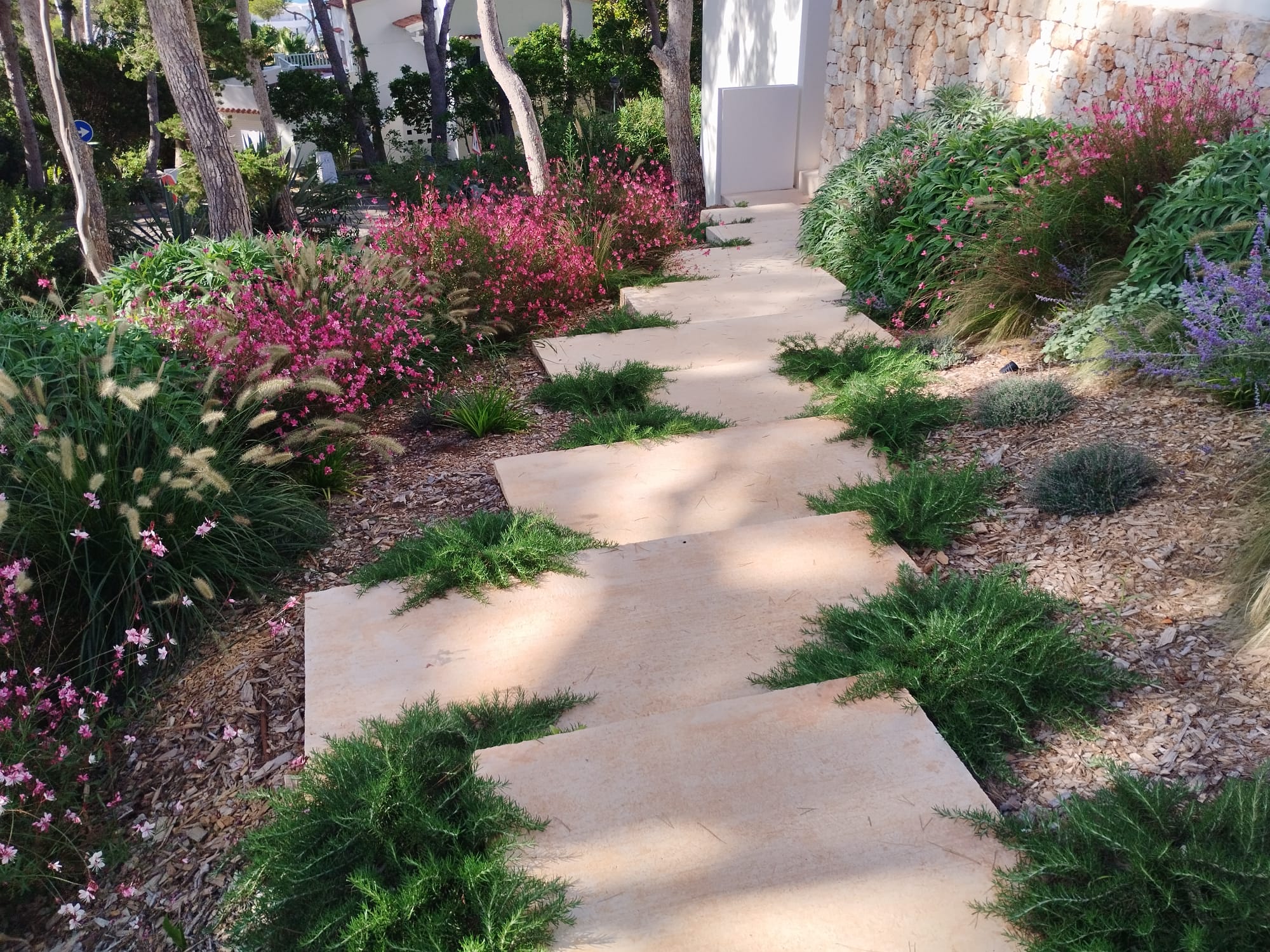 Nuestros proyectos de diseño de jardines mediterráneos sostenibles incluyen técnicas de mulching con restos de poda, que retienen humedad y aportan nutrientes; y la creación de bancales con pendientes suaves que favorecen la infiltración natural del agua. Para clientes preocupados por el impacto ambiental, diseñamos jardines con cero residuos, utilizando composta de jardín local y evitando productos químicos. La selección de especies autóctonas también beneficia a la fauna local, atrayendo polinizadores como abejas y mariposas. Trabajamos con expertos en jardinería mediterránea que conocen las microclimas de Menorca: las zonas costeras con salinidad, los interior-rios con heladas ocasionales, y las áreas protegidas donde la legislación restringe ciertas especies. Cada proyecto es una oportunidad para crear un ecosistema miniatura que funcione en armonía con el paisaje menorquín.