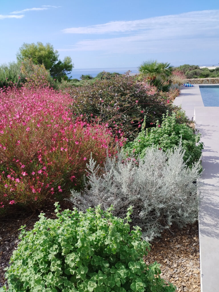 Trabajamos con especies vegetales emblemáticas como el robusto algarrobo, el olivo milenario, palmeras autóctonas resistentes, aromáticas mediterráneas de bajo consumo hídrico y plantas tapizantes que crean microclimas beneficiosos para el conjunto del ecosistema. La xerojardinería constituye una constante en todos nuestros proyectos profesionales, diseñando espacios verdes que mantienen su belleza y vitalidad incluso con limitaciones hídricas severas. Esta filosofía no solo resulta técnicamente necesaria en el contexto bioclimático de Menorca, sino que representa una responsabilidad medioambiental que asumimos con compromiso y conocimiento técnico especializado.